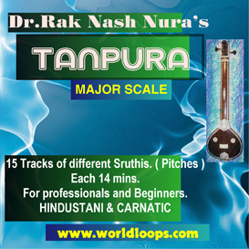 ancient Indian instrument . It is used by hindustani and Carnatic musicians as a background instrument .It gives a godly ambient sound which boosts the song and the singer . This is not a song album but a tanpura background album. This can be used by Indian and western Musicians as a base to maintain the basic pitch. The Tanpura is recorded with 15 different pitches . Each file runs upto 14 minutes each. This album is based on MAJOR CHORDS. You can use these 15 Mp3 files in your computer , cd player etc and sing along. Can be used by Professionals in concerts and also by beginners . Recorded in the high tech BRC studio by Dr.Rak Nash Nura and his team. You can use this file in recordings and trainings. You cannot sell the album or loop. Copyrighted to Dr.Rak Nash nura of World Loops. Contact us at worldloops@yahoo.com WEBSITE - www.worldloops.com |