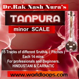 Indian instrument . It is used by hindustani and Carnatic musicians as a background instrument .It gives a godly ambient sound which boosts the song and the singer . This is not a song album but a tanpura background album. This can be used by Indian and western Musicians as a base to maintain the basic pitch. The Tanpura is recorded with 15 different pitches . Each file runs upto 14 minutes each. This album is based on MINOR CHORDS. You can use these 15 Mp3 files in your computer , cd player etc and sing along. Can be used by Professionals in concerts and also by beginners . Recorded in the high tech BRC studio by Dr.Rak Nash Nura and his team. You can use this file in recordings and trainings. You cannot sell the album or loop. Copyrighted to Dr.Rak Nash nura of World Loops. Contact us at worldloops@yahoo.com WEBSITE - www.worldloops.com |